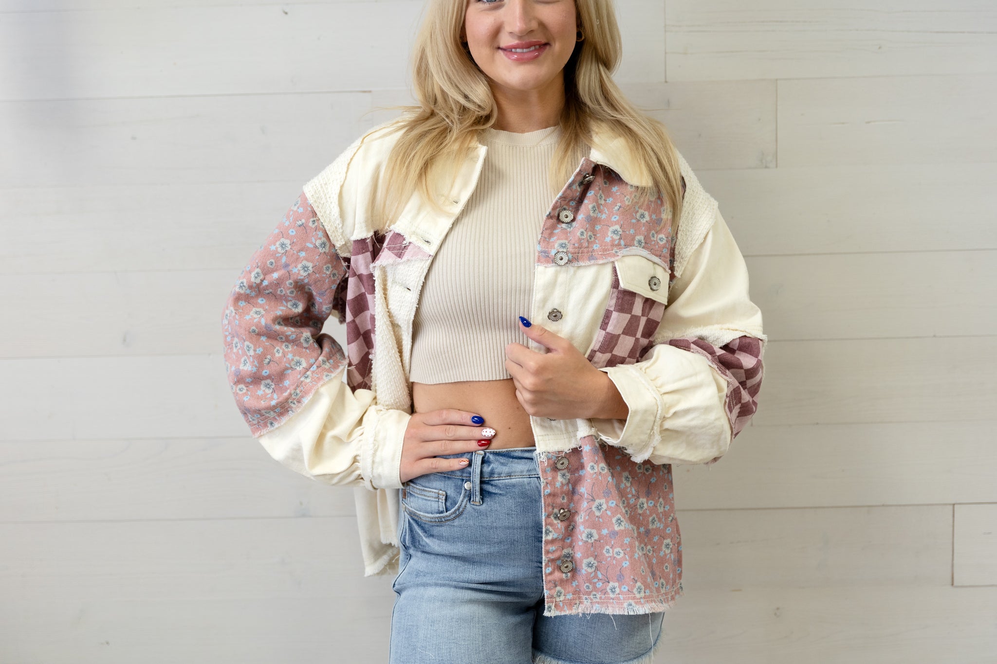 Denim Jacket with Cream Crochet Sleeves Model: 5'4" wearing size medium POL will be shipped from: The Burlap Buffalo 224...