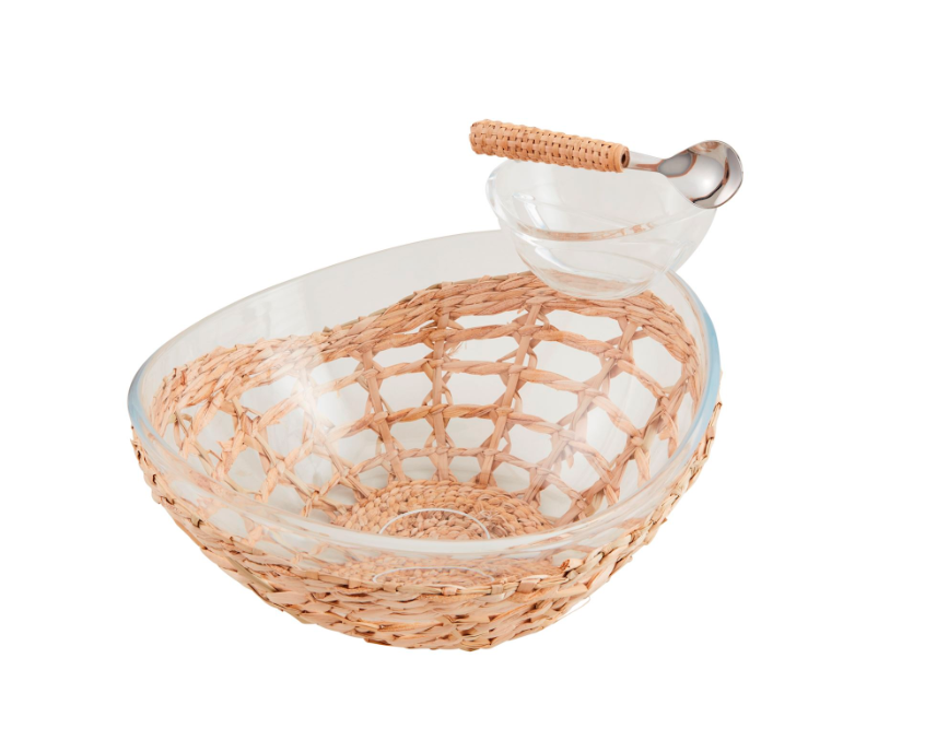 Acrylic Chip Dip 3-piece set. Acrylic chip bowl with removable dip cup features woven seagrass exterior sleeve. Comes with stainless...
