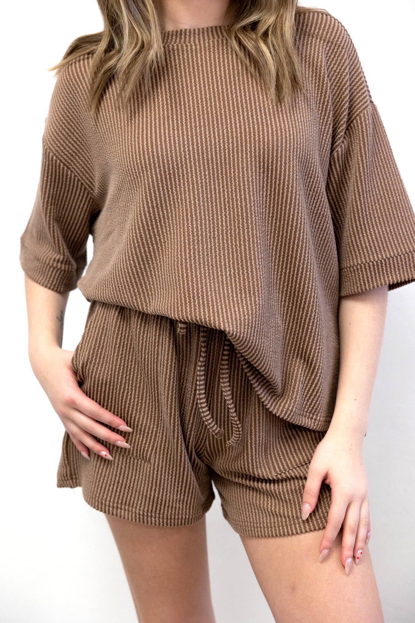 Raised Ribbed SS Tee & Short Set Brown Sweet, comfy, and effortlessly cute—this brown ribbed set is a must-have for...