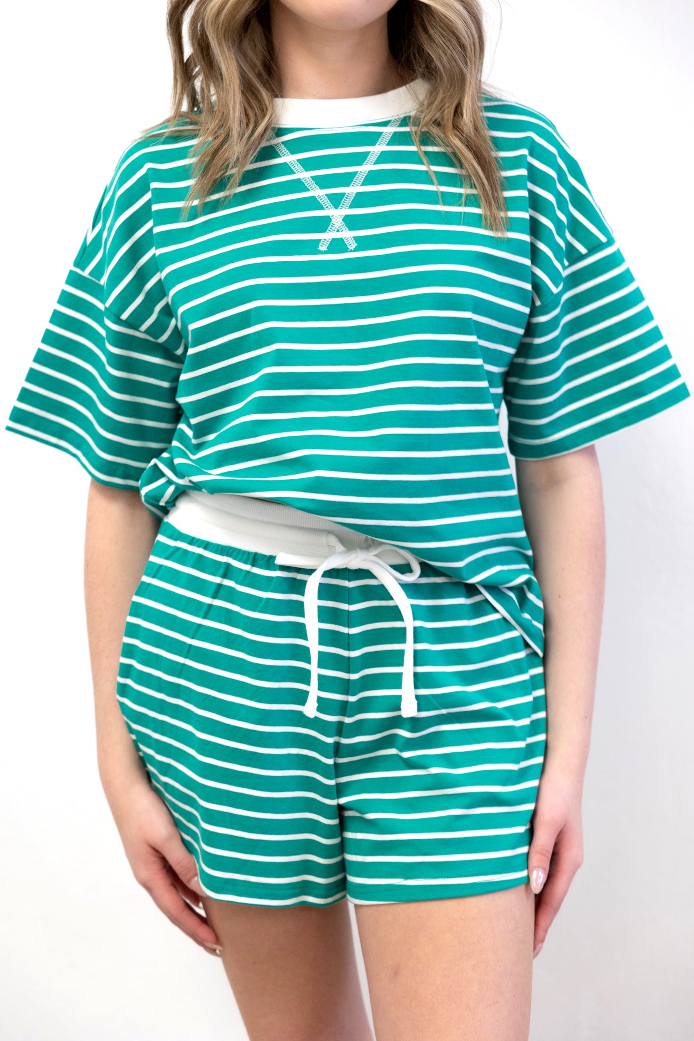 Striped Round Neck Tee Short Set Kelly Green Casual comfort meets sporty style in this green striped lounge set. Designed...