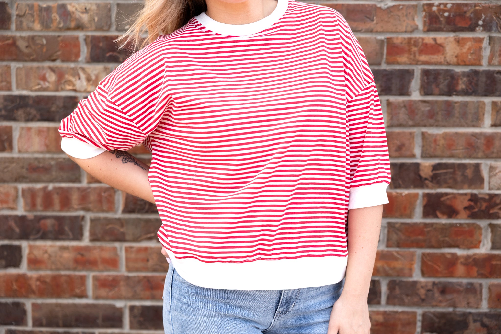 Striped Contrast Trim Rib Banded Top Ruby A fresh take on a classic stripe, this relaxed-fit tee features crisp red...