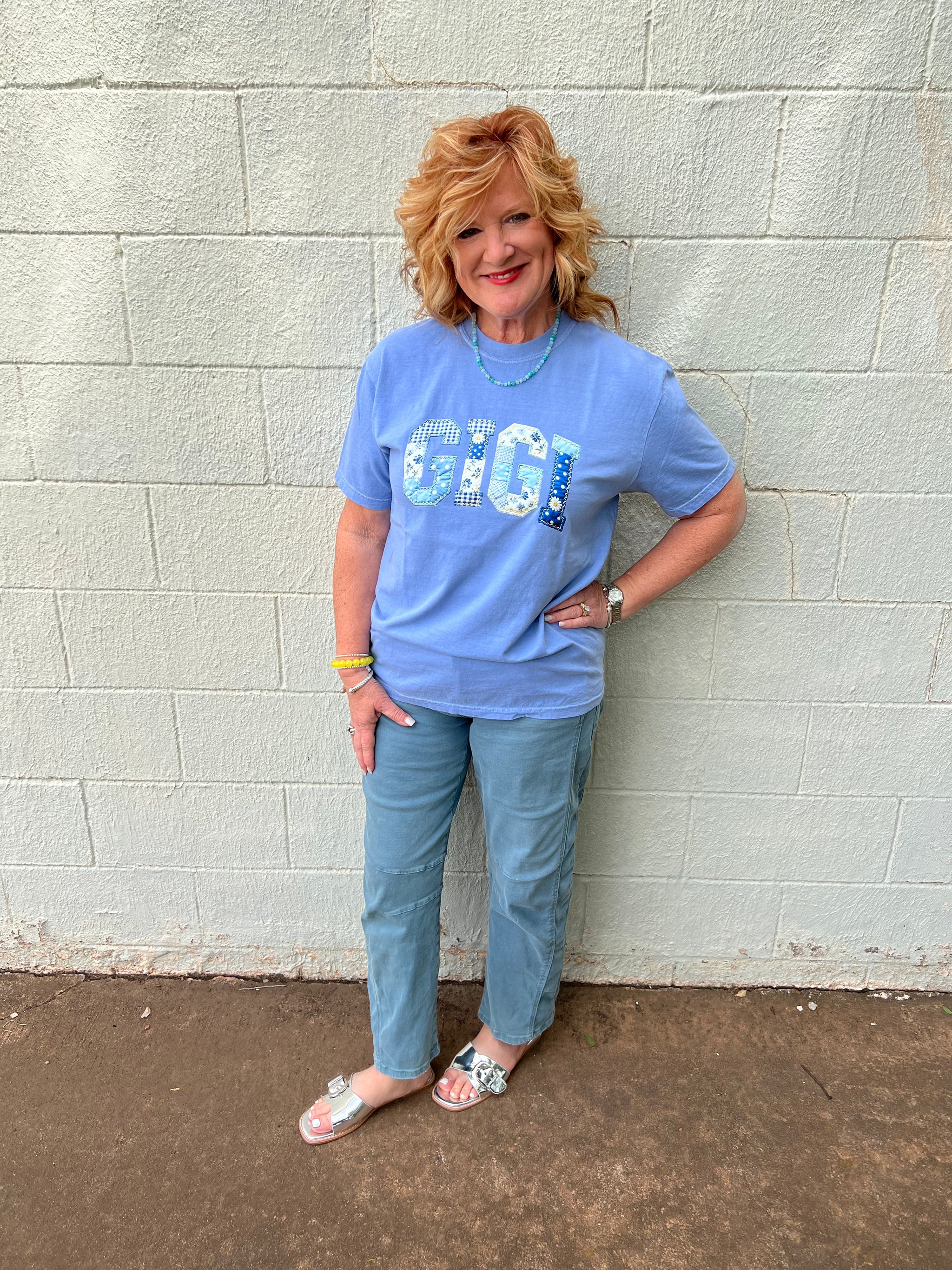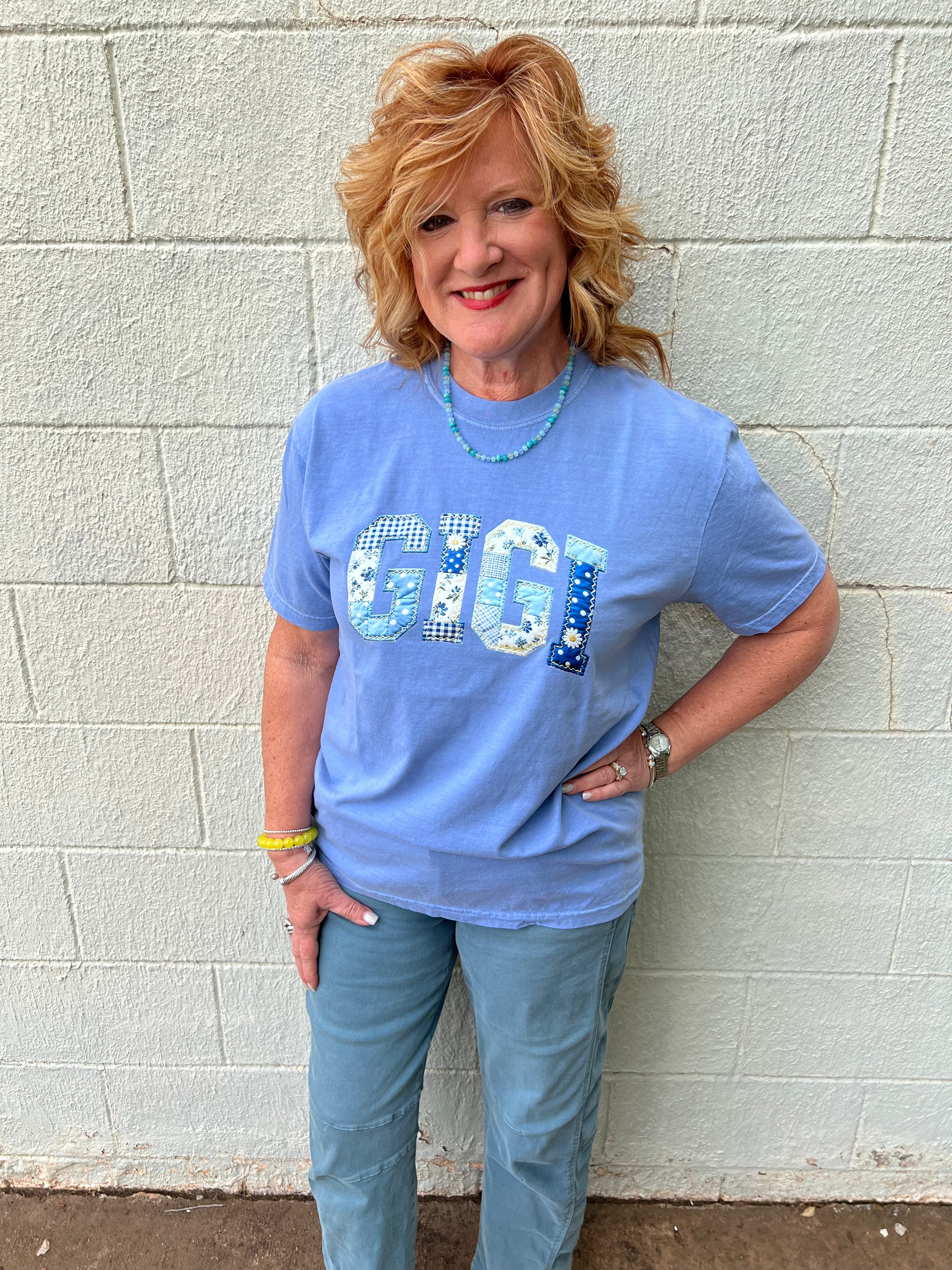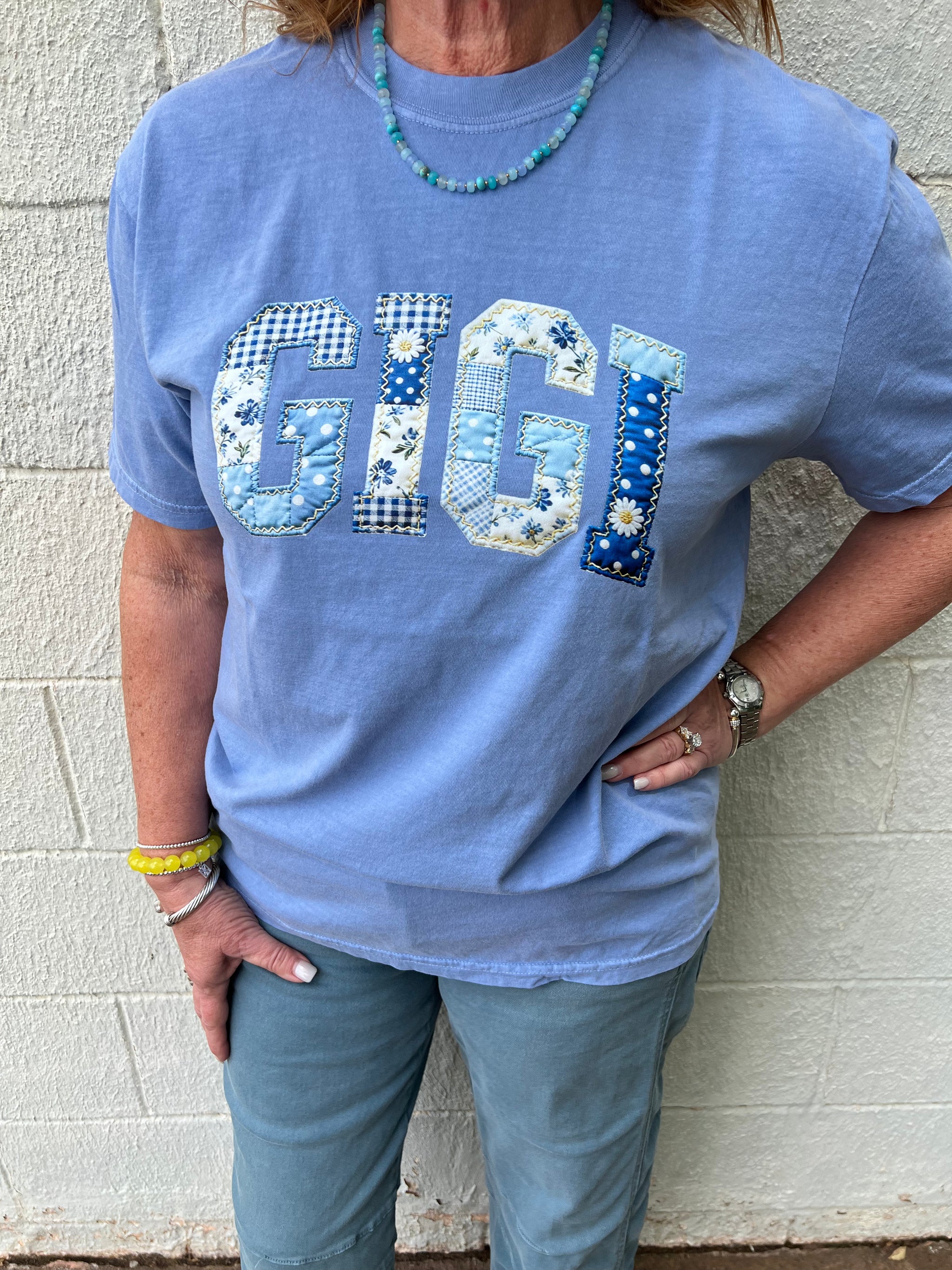 Gigi Patchwork Graphic Tee Washed Denim This GIGI graphic tee is the style! It is so cute. You can...