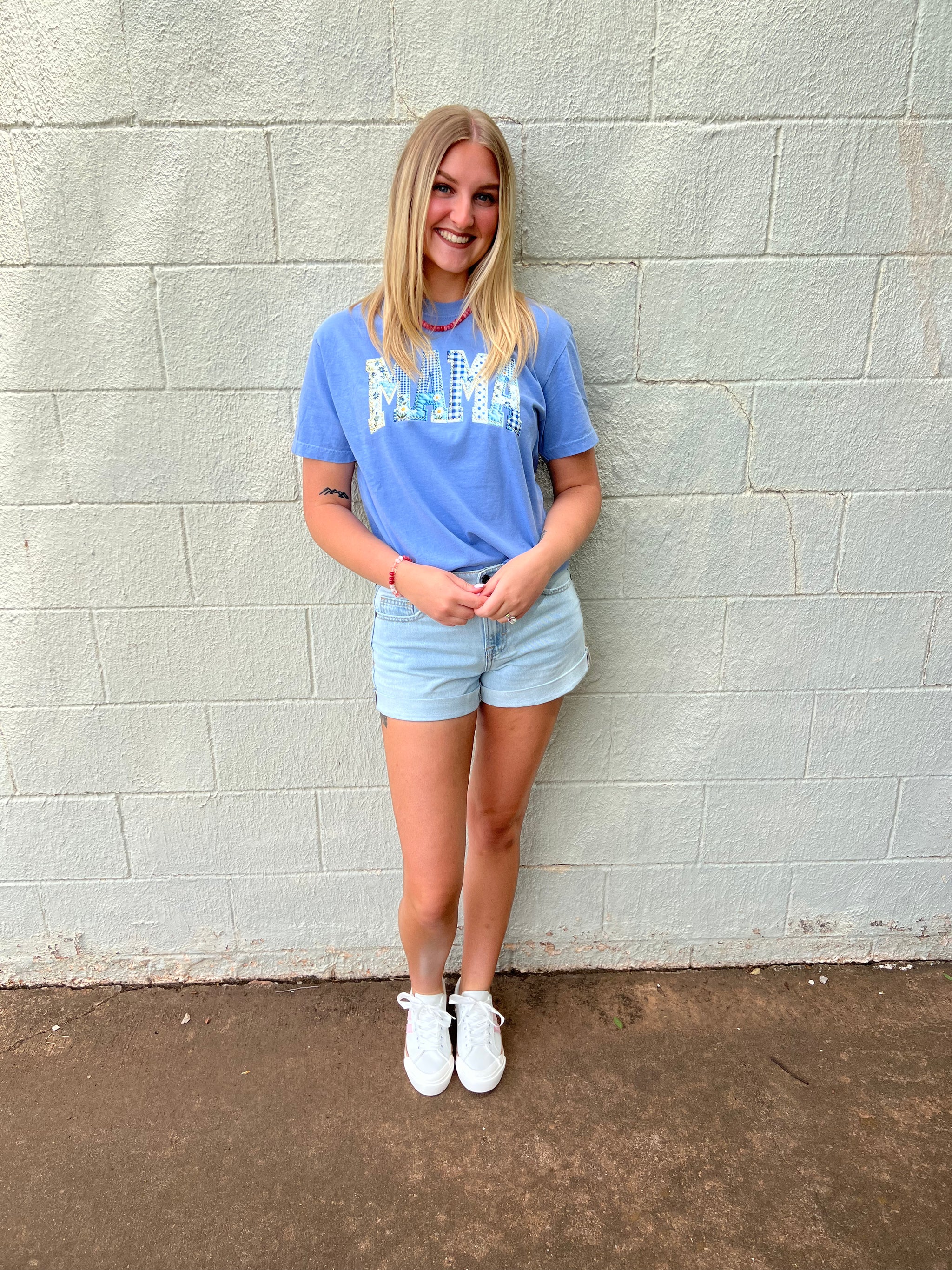 Mama Patchwork Graphic Tee Washed Denim This MAMA graphic tee is the style! It is so cute. You can...