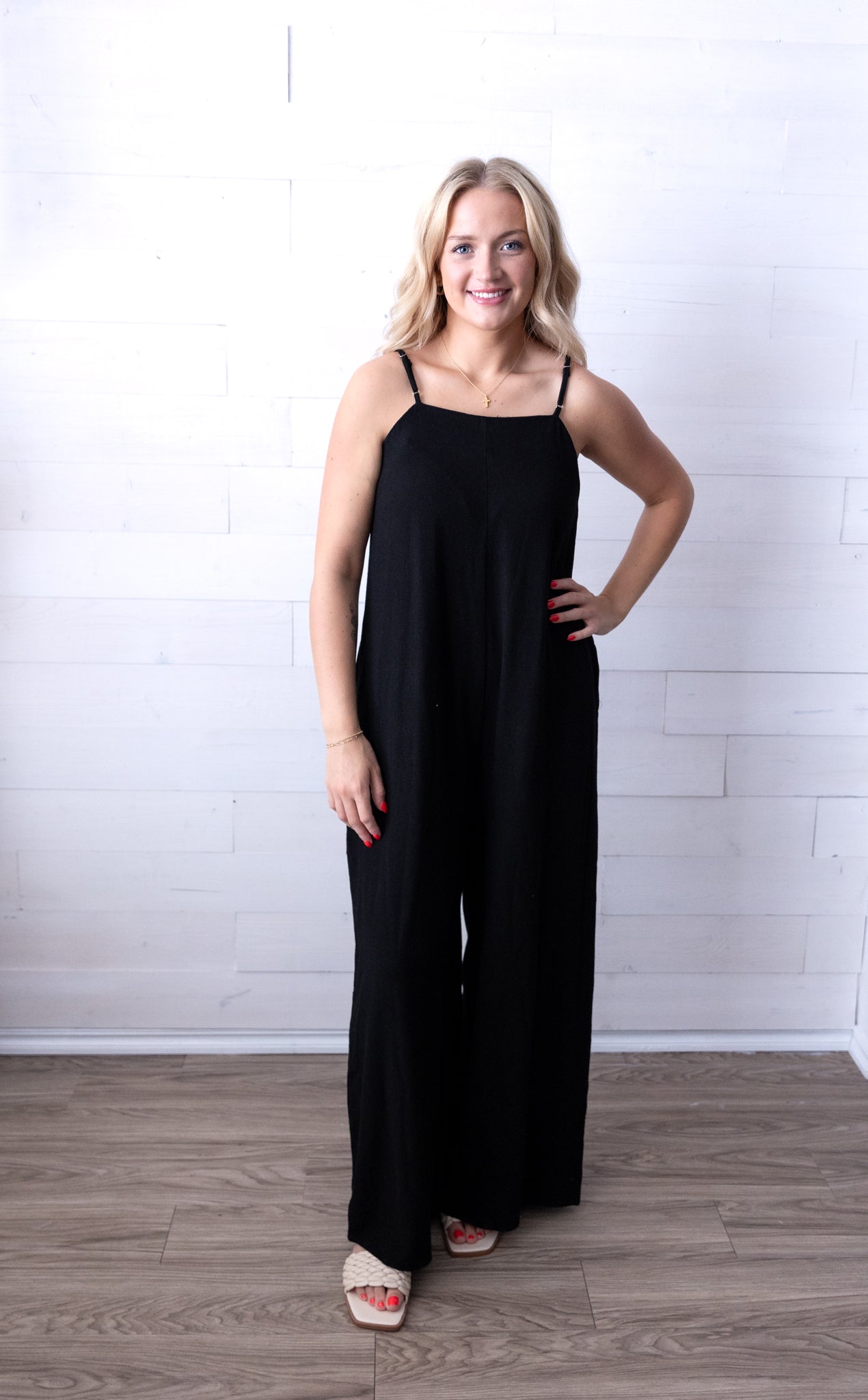 Black Wide Leg Jumpsuit with Skinny Straps Model: 5'4" wearing size small Very J will be shipped from: The Burlap...